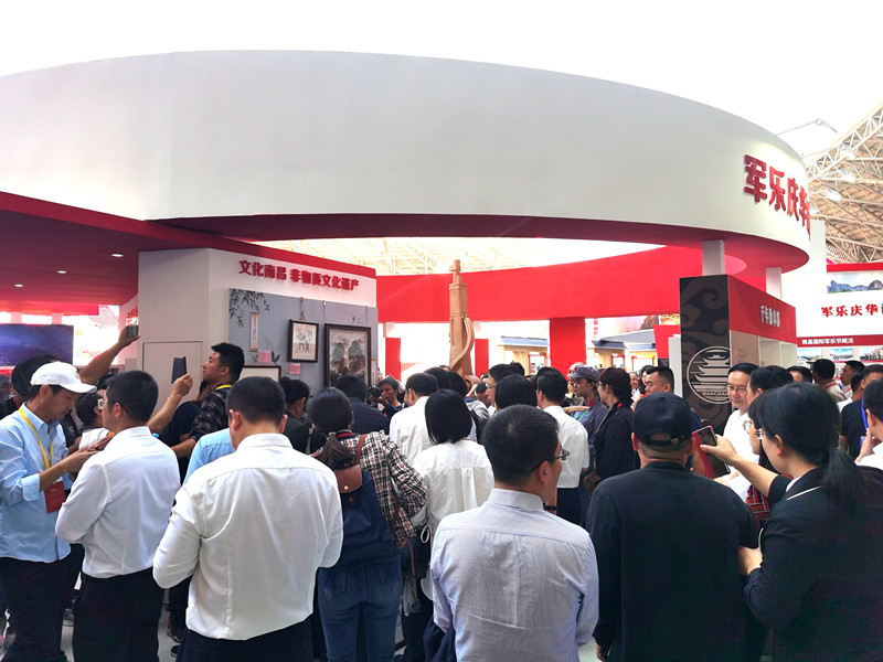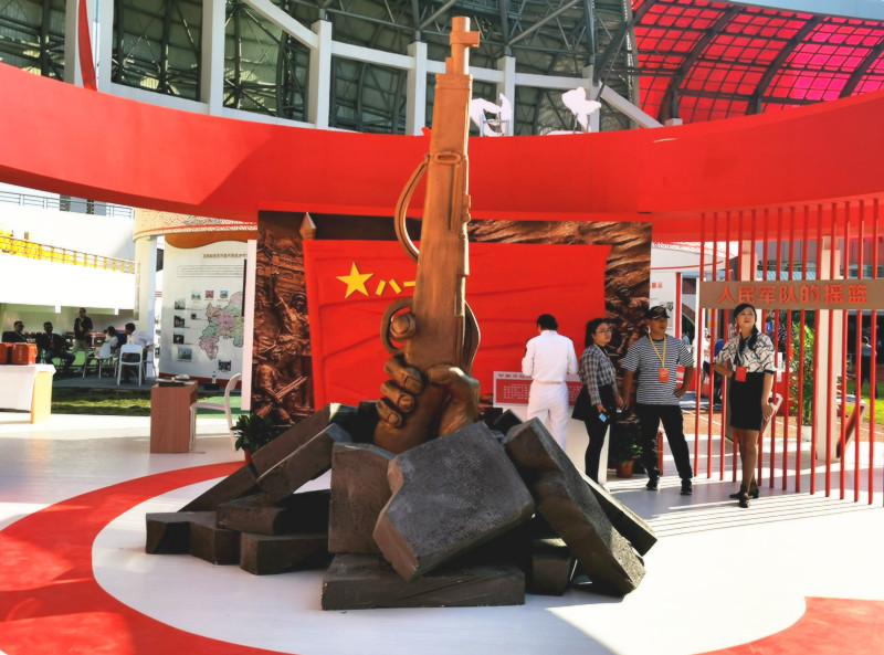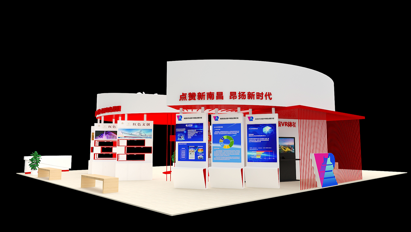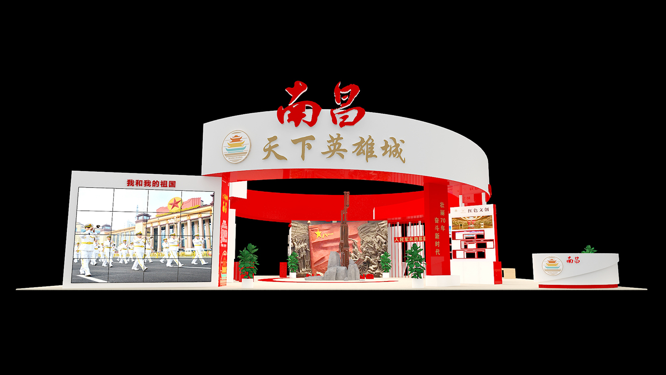 展臺總面積224平方,整個展臺是以南昌紅色文化為主導(dǎo)思想,采取不同的展板展示了八一館、新四軍舊址、滕王閣、南昌艦等的紅色文化景點(diǎn)及一些特色文創(chuàng)產(chǎn)品。南昌是人民軍隊(duì)的搖籃,是軍旗升起的地方,所以整個展臺以紅色調(diào)為主,更為突出這次展會的主題思想。